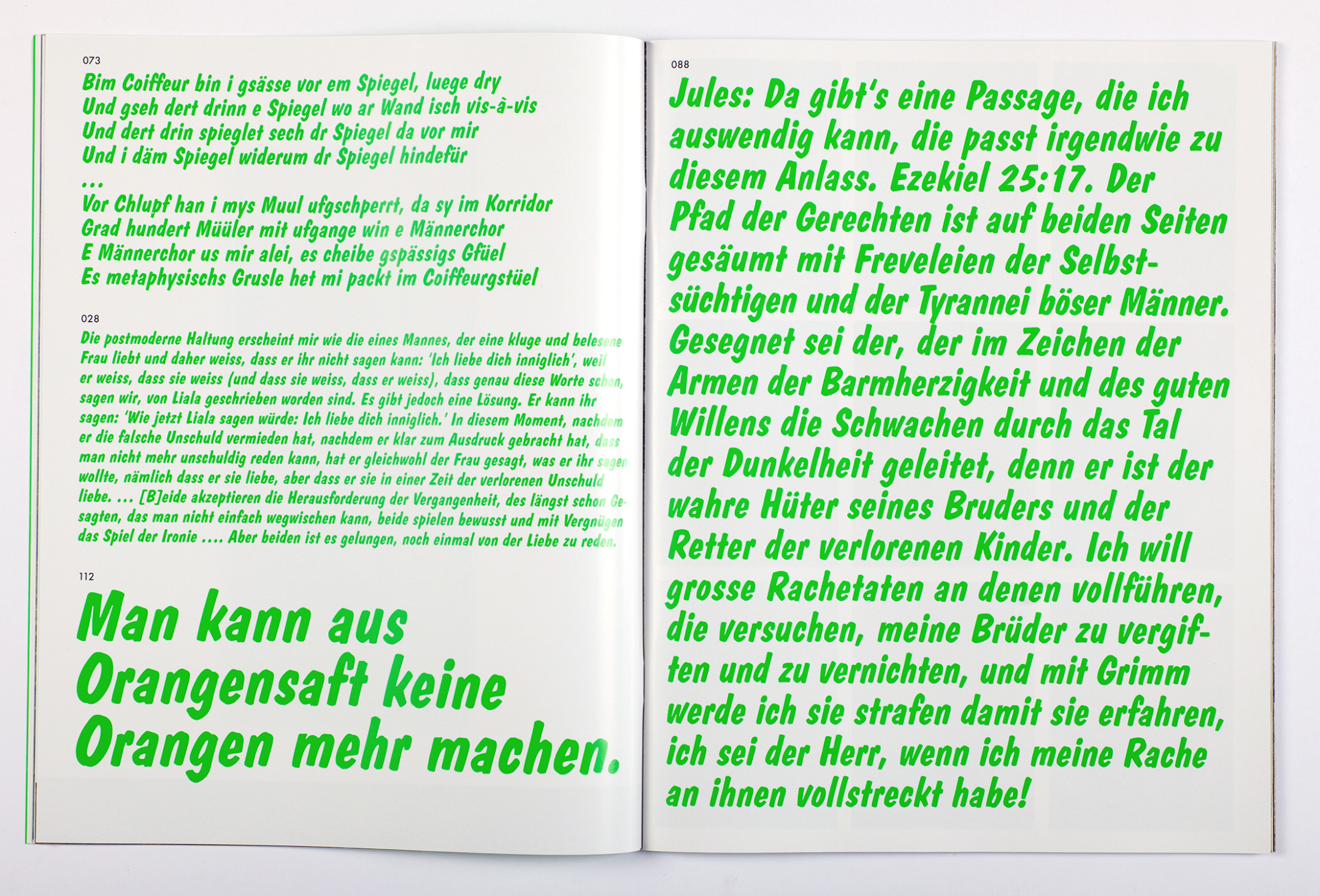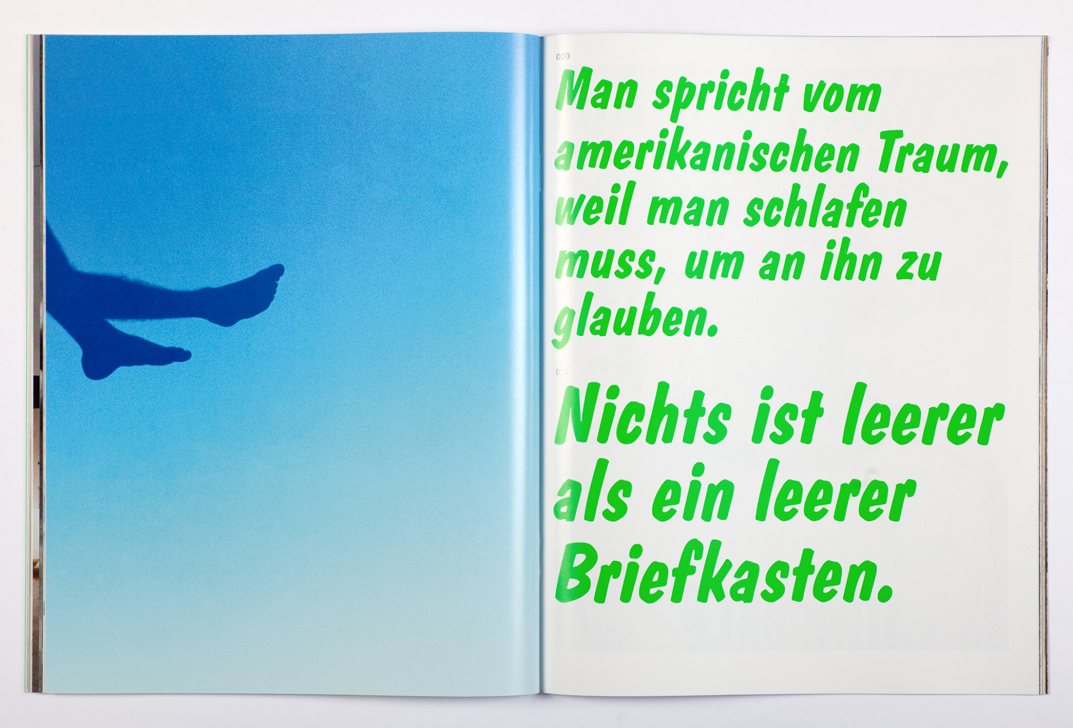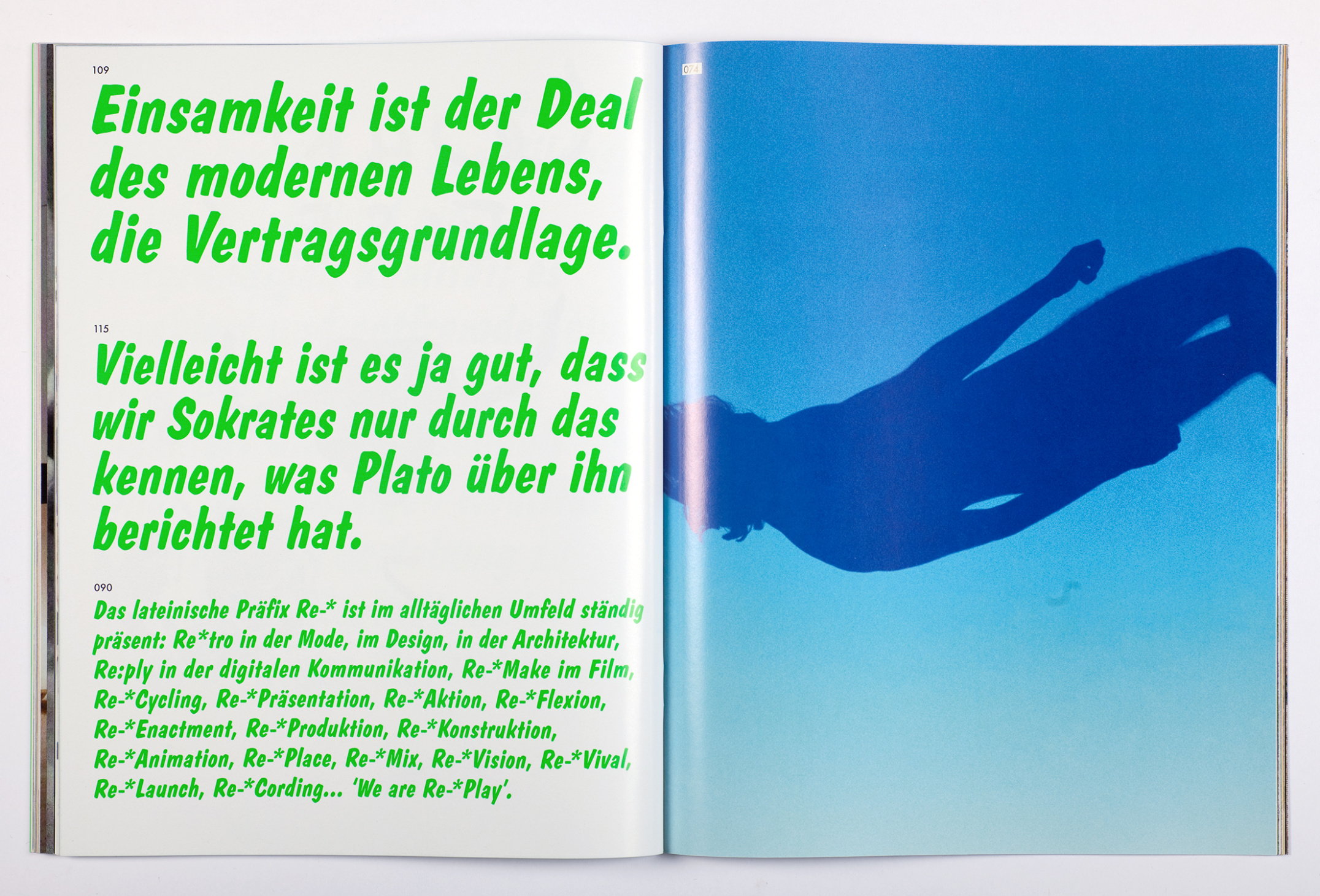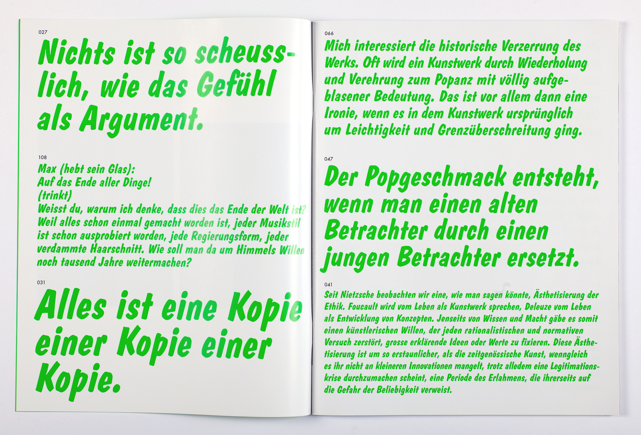 This somewhat unusual catalog accompanying the exhibition Karaoke – Photographic Quotes at Fotomuseum Winterthur is graphically and conceptually taking up the notion of photographs as quotes, but is also playing with karaoke-aspect mentioned in the title. Instead of working with the usual essay-like catalog-texts, we collected short quotes from various theoretical, literary and artistic texts and mixed them together with a selection of images from the exhibition: a catalog, playfully mimicking an evening in a karaoke-bar.